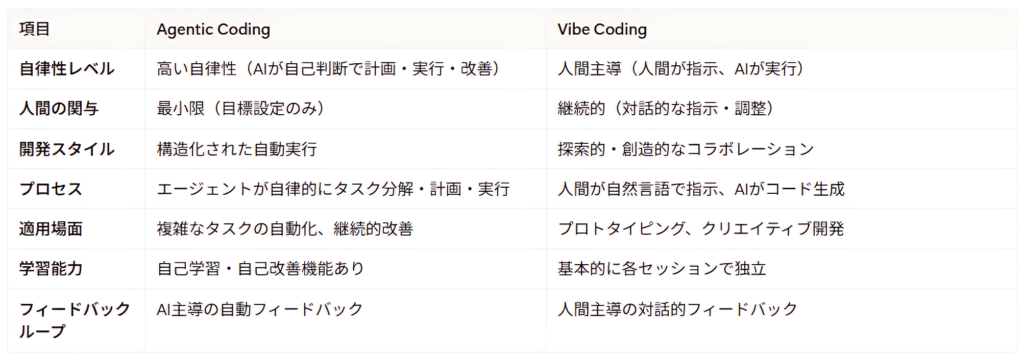 最近のソフトウェア開発で注目を集めているのが、Agentic Coding(エージェンティック・コーディング)やVibe Coding(バイブ・コーディング)です。これらはAIにコーディングを補助させるだけでなく、タスクを自己判断で実行させ、自然言語での指示に基づいてAIがコードを生成するという、より自律的なアプローチです。